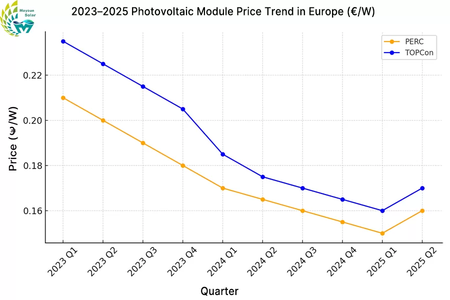 This slight price rebound in Q2 is partly due to the demand surge caused by earlier installation rushes, and partly influenced by China’s implementation of production capacity and price control policies in Q2 2025. Leading companies (such as Tongwei, Jinko, LONGi, etc.) have expressed their support for “controlling production capacity and stabilizing prices,” aiming to curb the expansion of low-price capacity. This move prompted European buyers to “lock prices” in advance during Q2 to mitigate potential future price fluctuations.