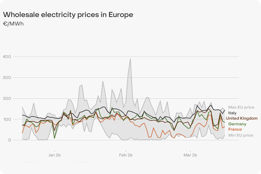 According to wholesale electricity price data from Ember, major markets such as Germany, France, Italy, and the UK have seen frequent fluctuations in recent months. Daily price differences were significant, with some periods maintaining prices above €100–€150/MWh, while during higher renewable energy output periods, prices dropped considerably, with some markets operating near lower price ranges. The price changes did not follow a single direction but rather reflected a widening range.