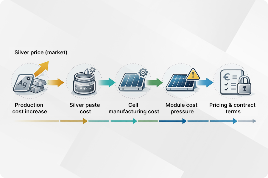 V případě stříbra nejde pouze o finanční výkyv. Jako klíčový materiál v procesu metalizace fotovoltaických článků — široce používaný ve stříbrné pastě, elektrodách a přenosu proudu — má jeho cenový vývoj přímý dopad na nákladovou strukturu výroby článků i fotovoltaických panelů.
